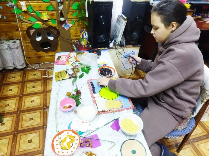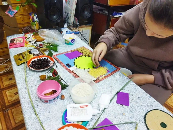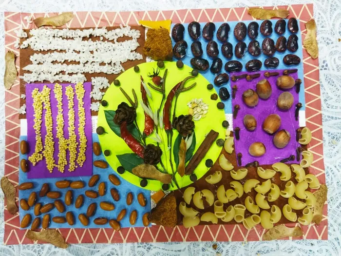 "Спонтанно берём наугад из ёмкости крупы и природные материалы, собранные ранее на экскурсиях, — к чему потянулась рука, то и используем. Выкладываем и приклеиваем последовательно внутри рамки всё, что приготовили. Главное — ощутить связь с природой. В процессе творчества активно работают зрительная и осязательная системы восприятия, развивается мелкая моторика рук, что уже само по себе оказывает терапевтический эффект. В результате выполнения этой несложной техники наше внутреннее состояние приходит в равновесие. Прикасаясь к элементам природы, мы словно проникаемся её энергией, ощущаем мистическую связь со стихиями и получаем мощный заряд бодрости. Надолго задаём себе положительный эмоциональный настрой".